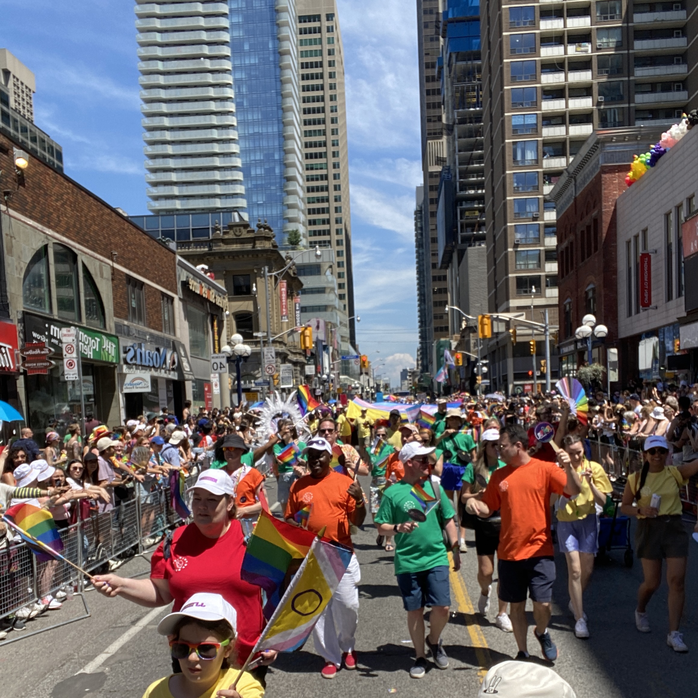 11:45AM: Dixon Hall staff gathered in front of 190 Carlton. T-shirts and pride flags were distributed before we departed for Bloor and Church Streets where we were to meet with Friends of Ruby.