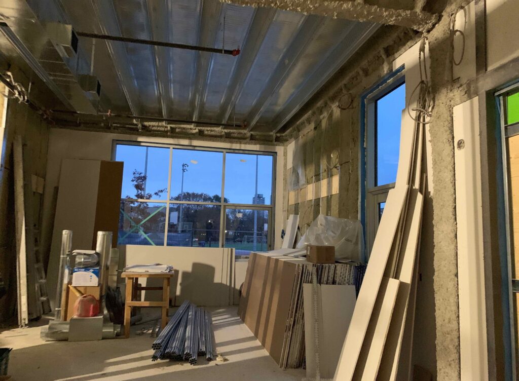 We’re happy to share another project milestone – the one year anniversary of breaking ground on the centre and beginning the construction phase of our journey! Construction has progressed quickly over the last 12 months, and we have completed the exterior cladding, windows and doors and are currently installing interior drywall.